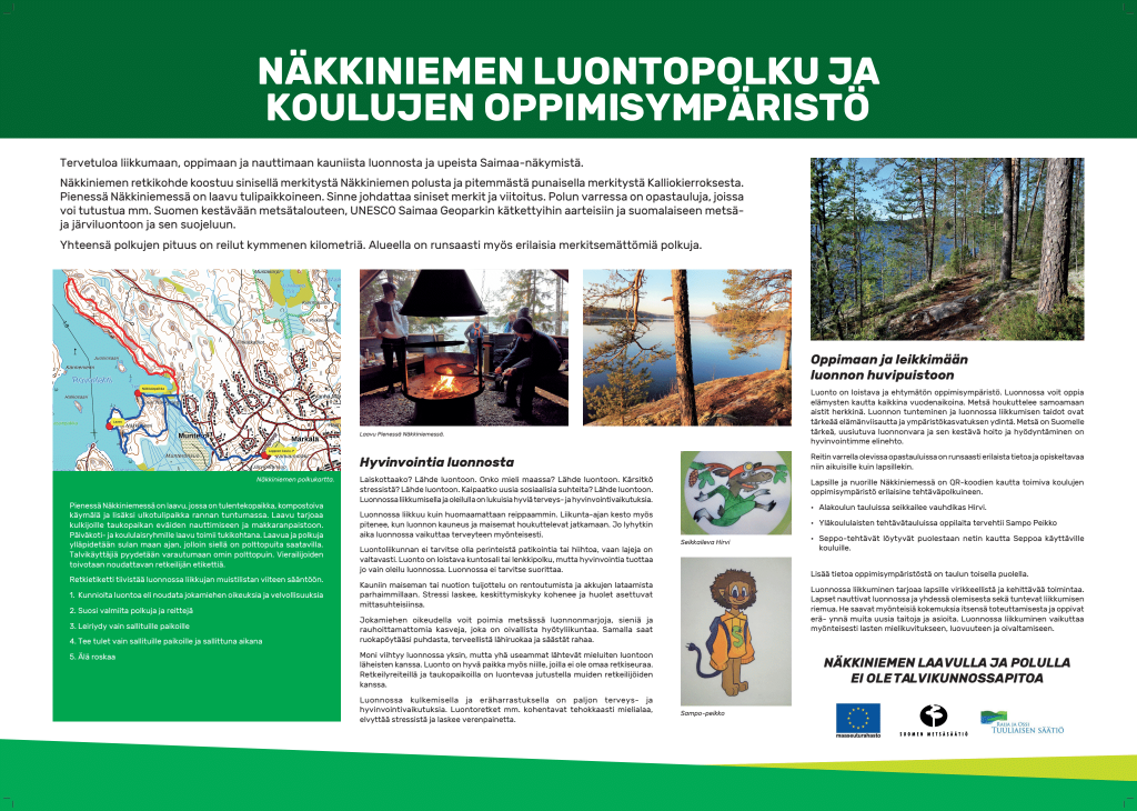 Länsi-Saimaan retkeily- ja matkailupalvelut ry rakentaa Näkkiniemeen tilavan kotalaavun tukipaikkoineen, käymälä ja varastotilat, nuotiopaikan sekä pöytiä ja penkkejä. Polun varteen tulee levähdyspaikkoja, joiden yhteyteen tulee opastauluja ja sähköinen reittiopastus. Opettajat kehittävät kohteeseen metsäluontoaiheisen koulujen oppimisympäristön eri luokka-asteille.